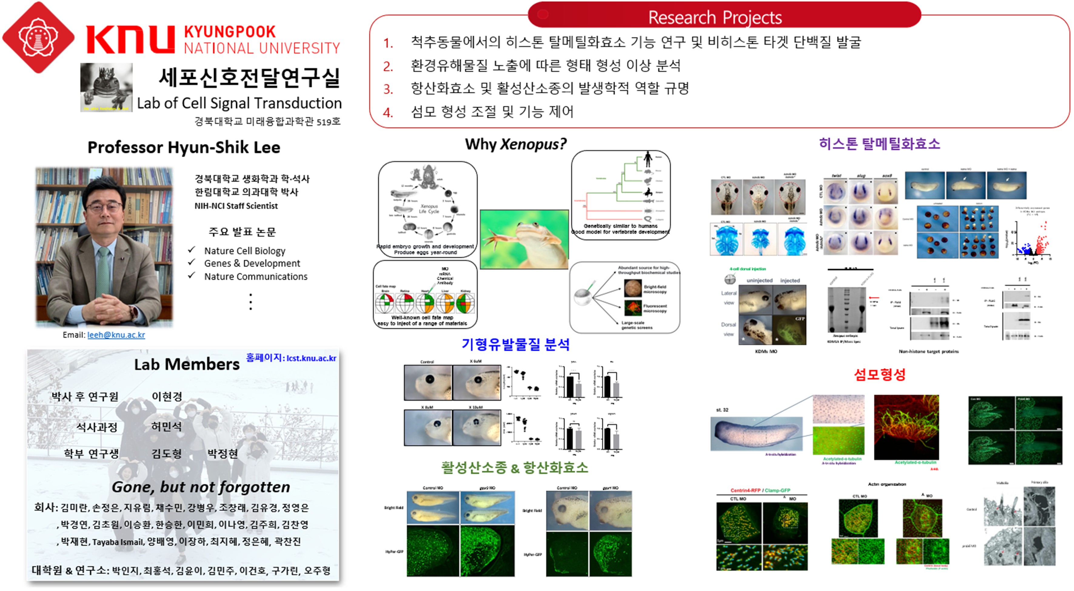 × 이현식 교수 Lee, Hyun-Shik 전공 세포신호전달 최종학력 이학박사, 한림의대 연구실미래융합과학관 521호 연락처053-950-7367 이메일leeh@knu.ac.kr 연구실 홈페이지 담당 교과목 생화학1 유기화학1,2 기초생명공학실험 연구분야 신호전달학 발생학 생화학 목록 이전글김상룡 24.06.18 다음글정선요 24.06.18