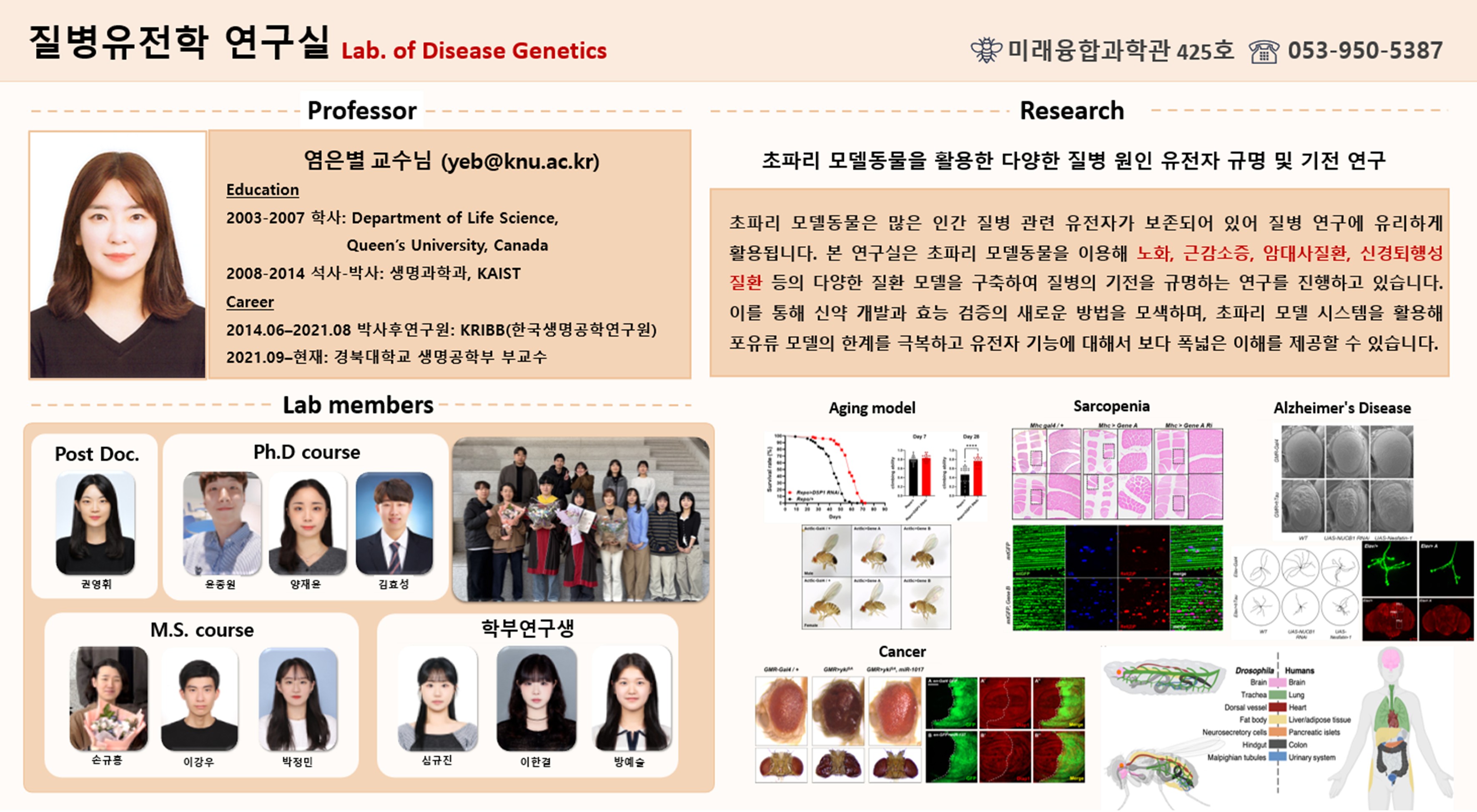 × 염은별 교수 Yeom, Eunbyul 전공 분자유전학 최종학력 이학박사, KAIST 연구실미래융합과학관 424호 연락처053-950-5387 이메일yeb@knu.ac.kr 담당 교과목 생화학1,2 미생물학1 발생학 연구분야 분자유전학 발생학 노화생물학 목록 이전글김사현 24.06.18 다음글김주현 24.06.13