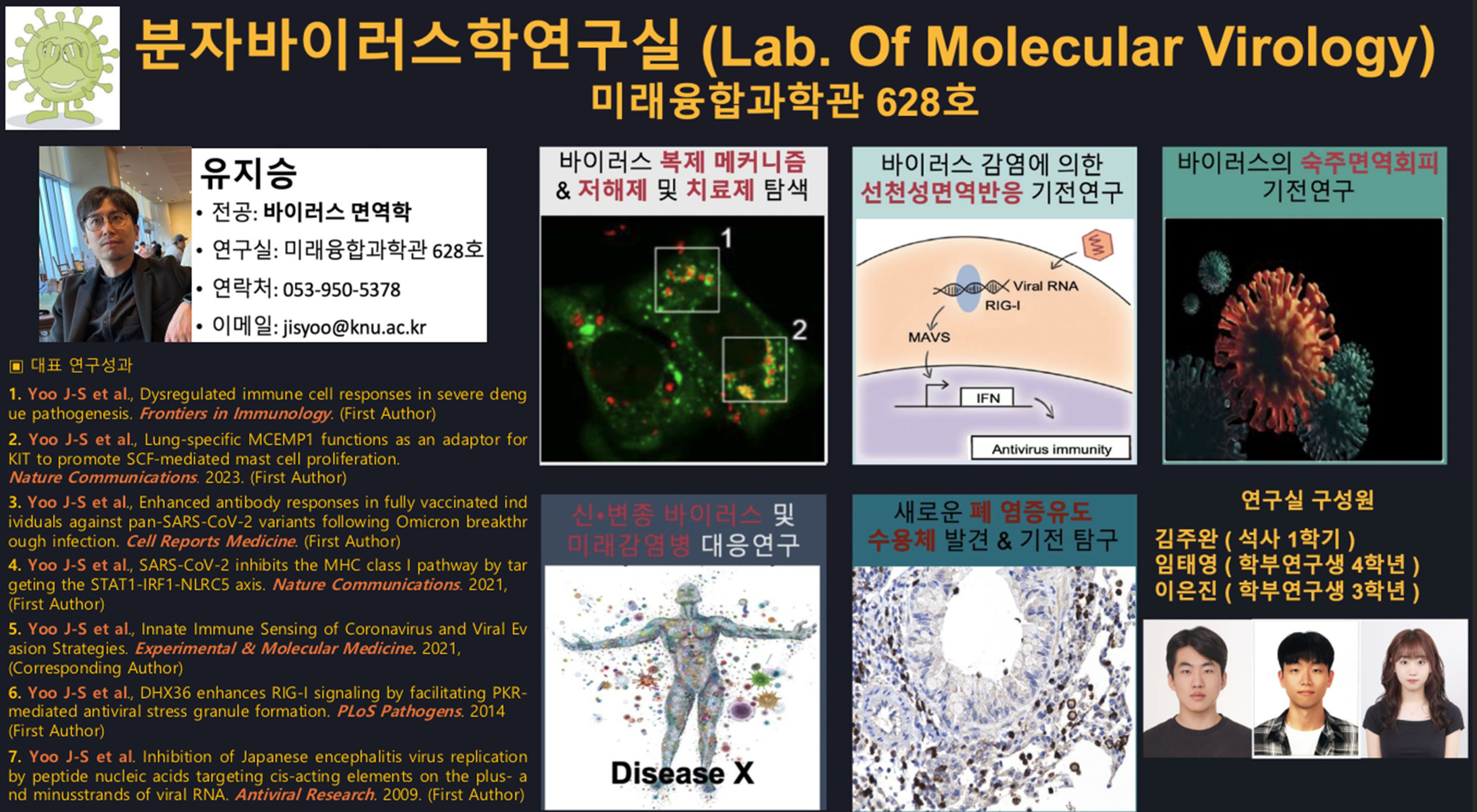 × 유지승 교수 Yoo, Ji-Seung 전공 분자바이러스학 최종학력 이학박사, Kyoto University, Japan 연구실미래융합과학관 628호 연락처053-950-5378 이메일jisyoo@knu.ac.kr 담당 교과목 세포생물학1,2 바이러스학 의학바이러스학 연구분야 신호전달학 바이러스학 면역학 목록 이전글이대영 24.06.18 다음글이준영 24.06.18