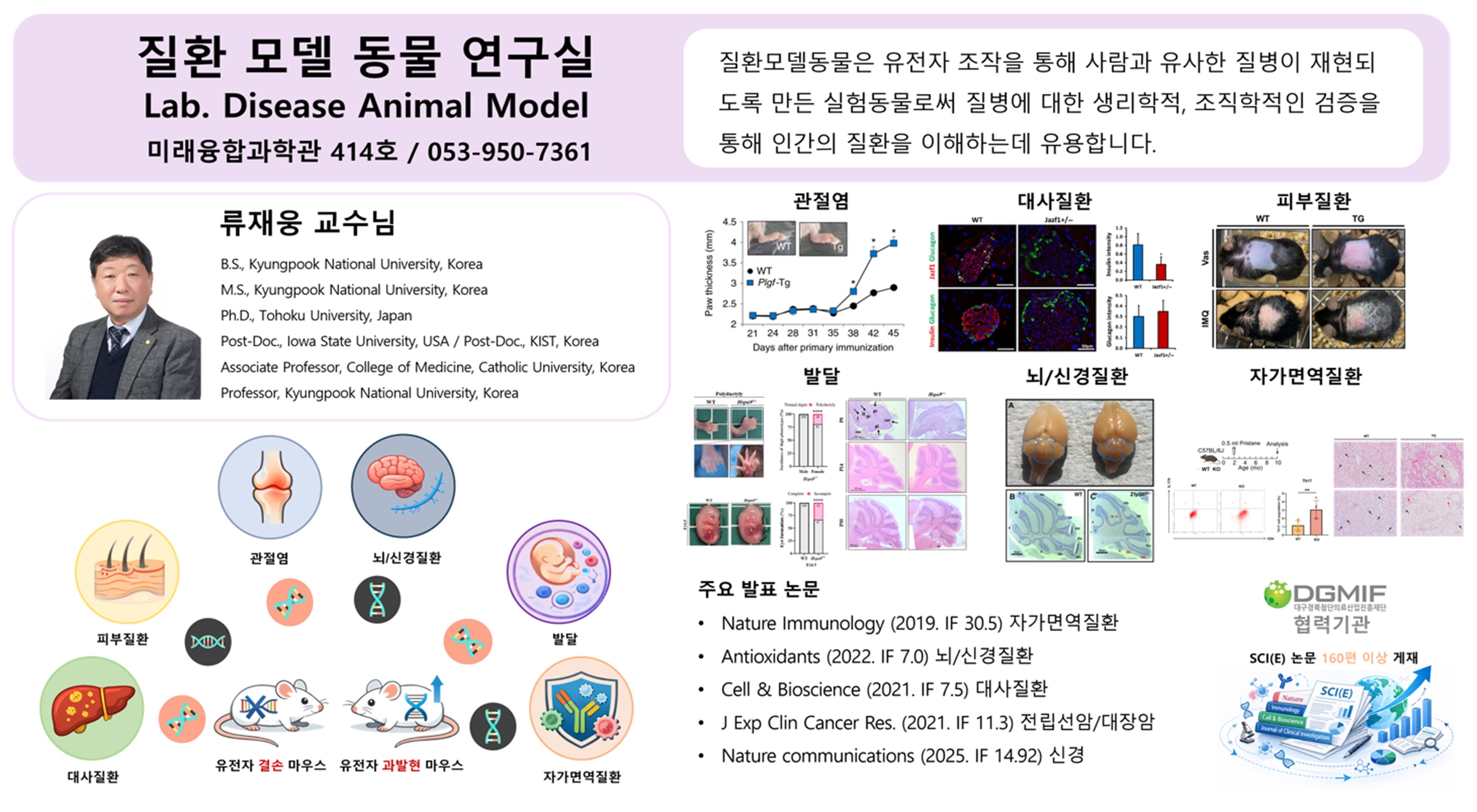 × 류재웅 교수 Ryoo, Jae-Woong 전공 실험동물학 최종학력 농학박사, Tohoku Univ., Japan 연구실미래융합과학관 415호 연락처053-950-7361 이메일jaewoong64@knu.ac.kr 담당 교과목 동물조직해부학 실험동물학 유도줄기세포학 연구분야 분자유전학 발생학 전임상학 목록 이전글이상규 24.06.18 다음글강범식 24.06.18